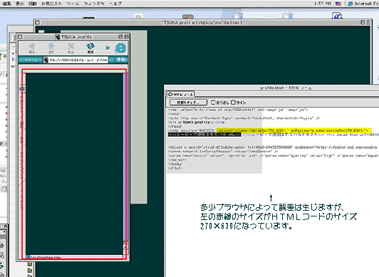 <!-- サイズ固定 --> <body bgcolor="#003333"onLoad="window.resizeTo(270,630); "onResize="window.resizeTo(270,630);">をHTMLソーズに打ち込みます。これで指定が完了です。 それと、すごい発見なんだが、safariには双方いづれか1000を超えるサイズを指定すると機能しなくなるという事が判明しました。しかも読み込む順番はcssを手前にしないとdreamweaverで作業する際形が崩れるというオマケ付き。(奧が深!)window.resizeToではなく、window.resizeByを使い window.resizeBy(dx,dy);を使う方法も有るようだが…
